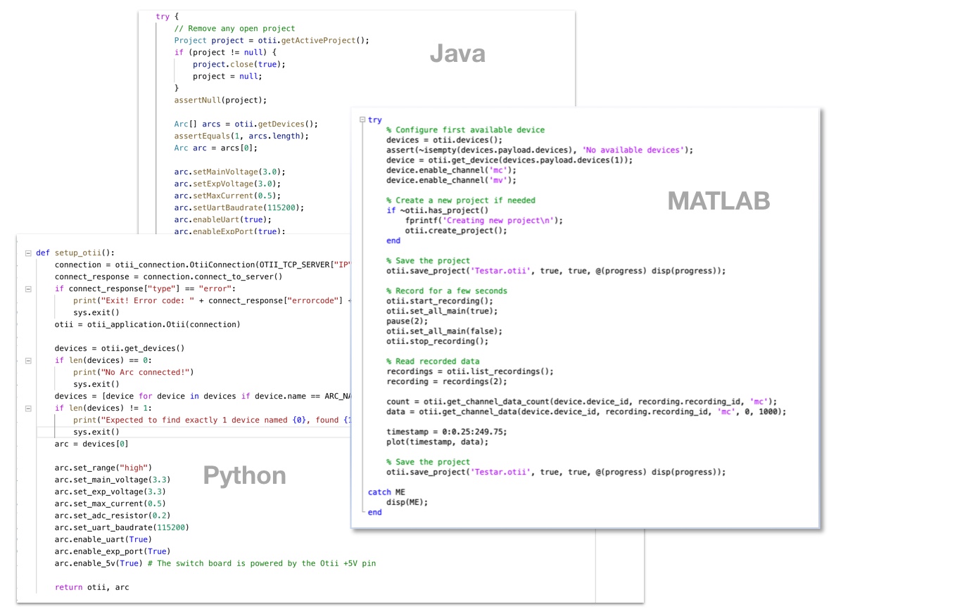 Otii Automation Toolbox makes Otii boxes programmable. Control your Otii box with the built-in TCP server from any language or system that supports communication over TCP sockets, using a JSON-based API.