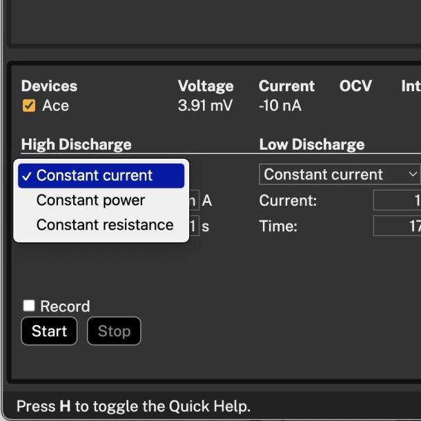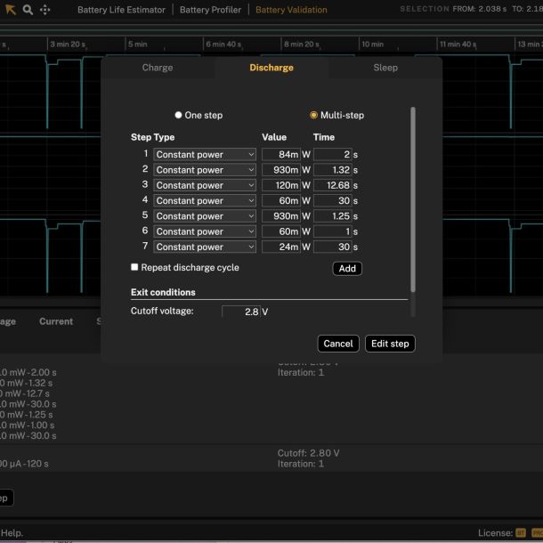 Build your profile by combining different types of states: discharge, sleep and charge. For discharge, you have the flexibility to set several sub-steps. Choose from discharging at constant current, power or resistance.