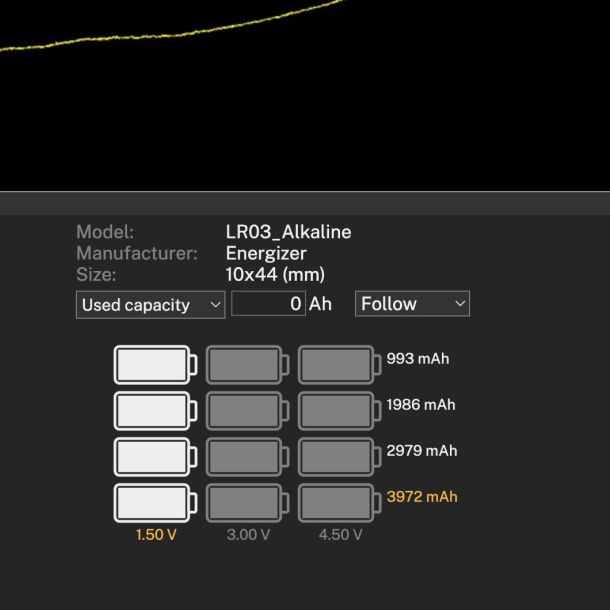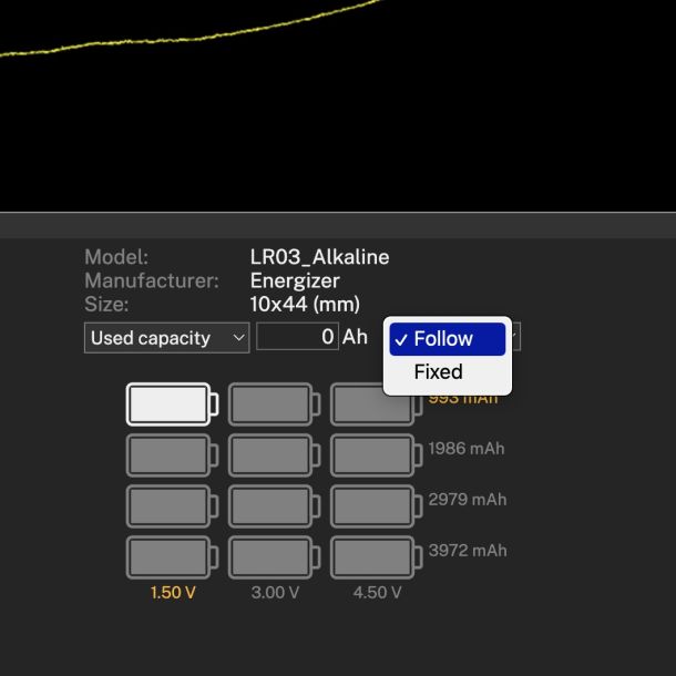The Follow option will simulate a discharge over the time you are recording. Choose this option if you want the tool to emulate the battery and change behavior as the energy is consumed from the battery. Position in the discharge curve will then move as your device consumes energy.