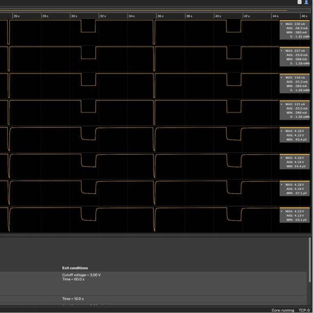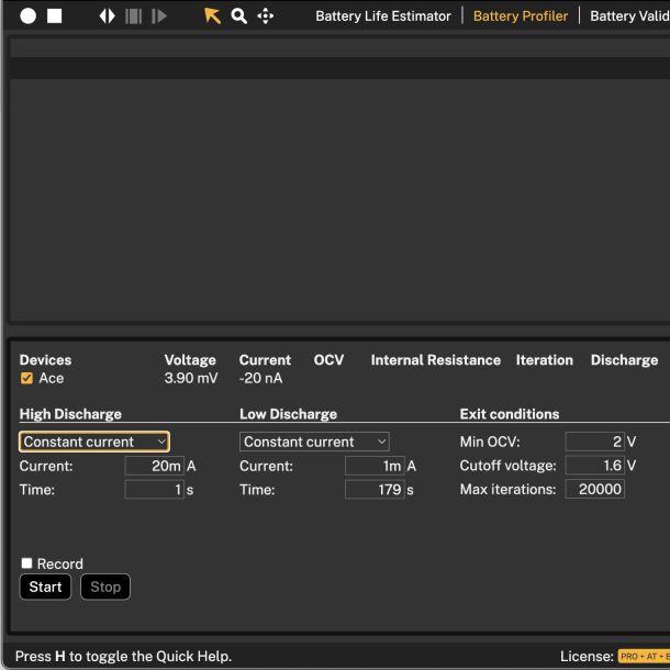 Otii hardware acts as a battery, following the profiled discharge curve. Choose a battery profile that you have created and the discharge curve will be shown for that battery for the conditions set during the profiling.